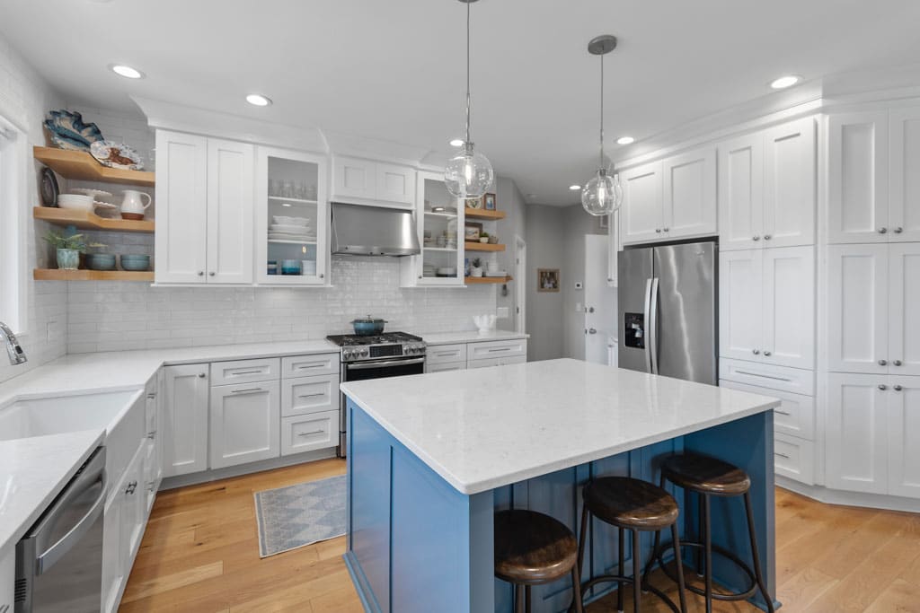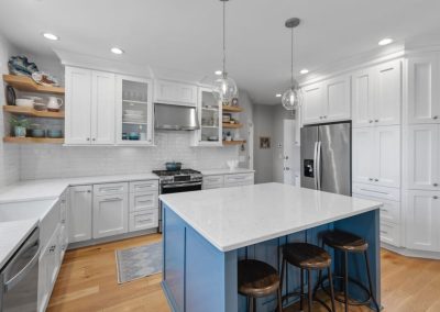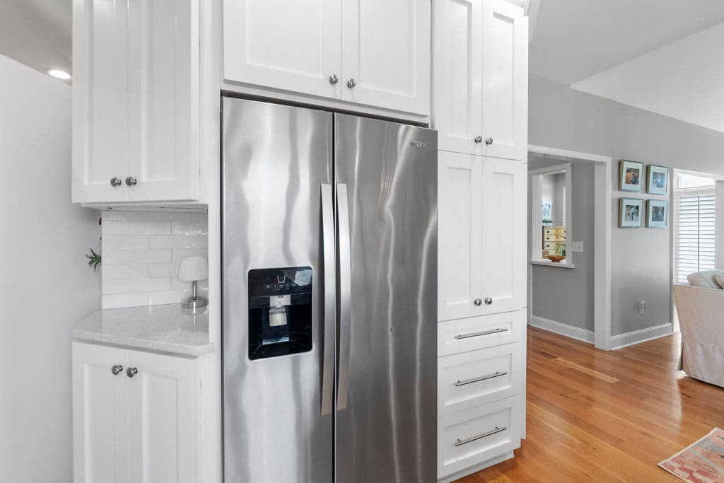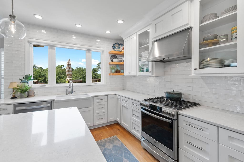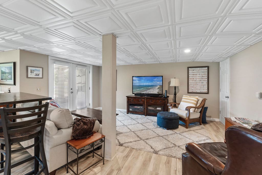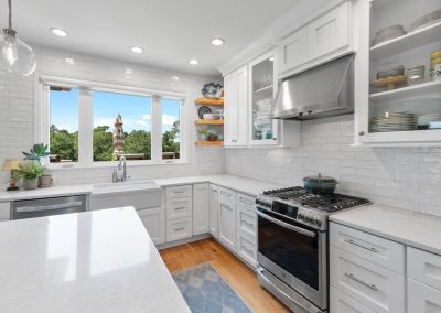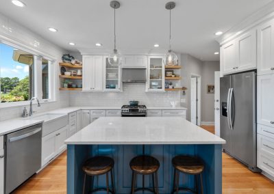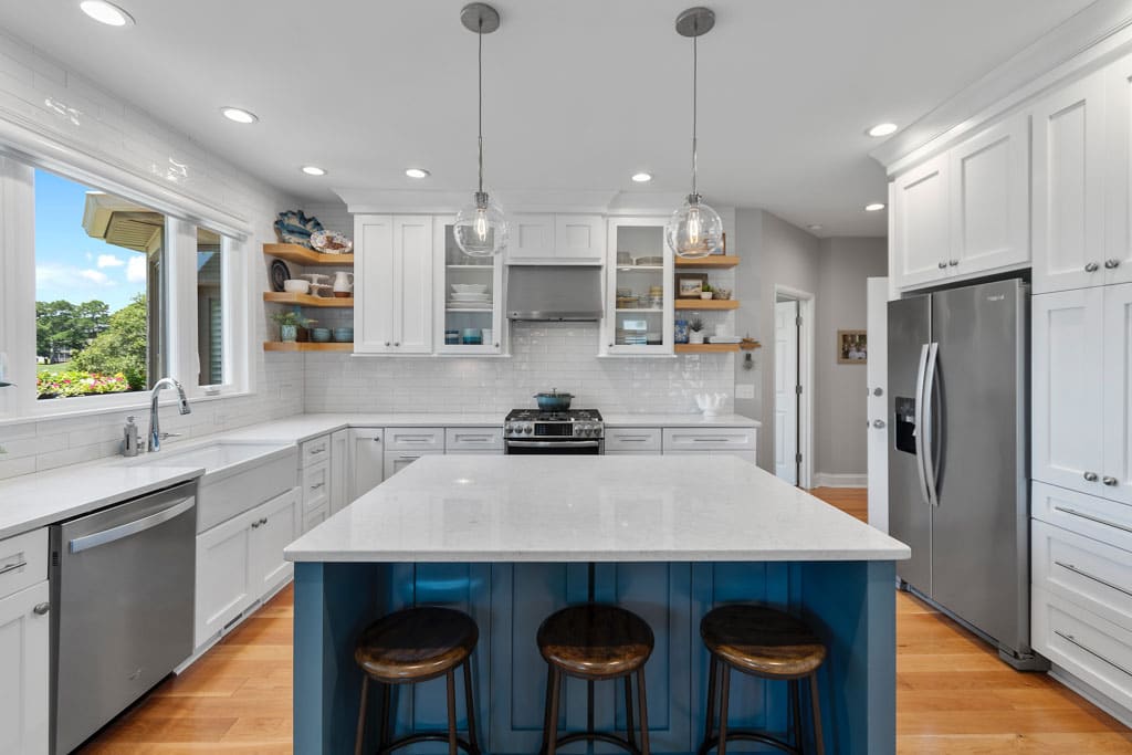 There is plenty of room to stretch out here, with the primary bedroom downstairs along with the kitchen, living room, dining room, sunroom, powder room and a den. Upstairs are two additional bedrooms, a bonus room and a full bathroom so guests can have their own space, and you can maintain your privacy. The primary suite is your retreat at the end of the day, with generous space and a beautiful bathroom with tiled, walk-in shower. It is very difficult to find a basement of any type in this area, so this walkout basement with adjoining storage area is a rare gem! It opens to a spacious covered patio area, adjacent to the outdoor shower. Recent updates include a remodeled kitchen that was opened up to the living room, with new cabinetry, an added island, and new counters and flooring.