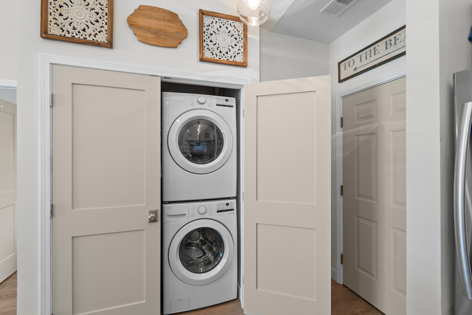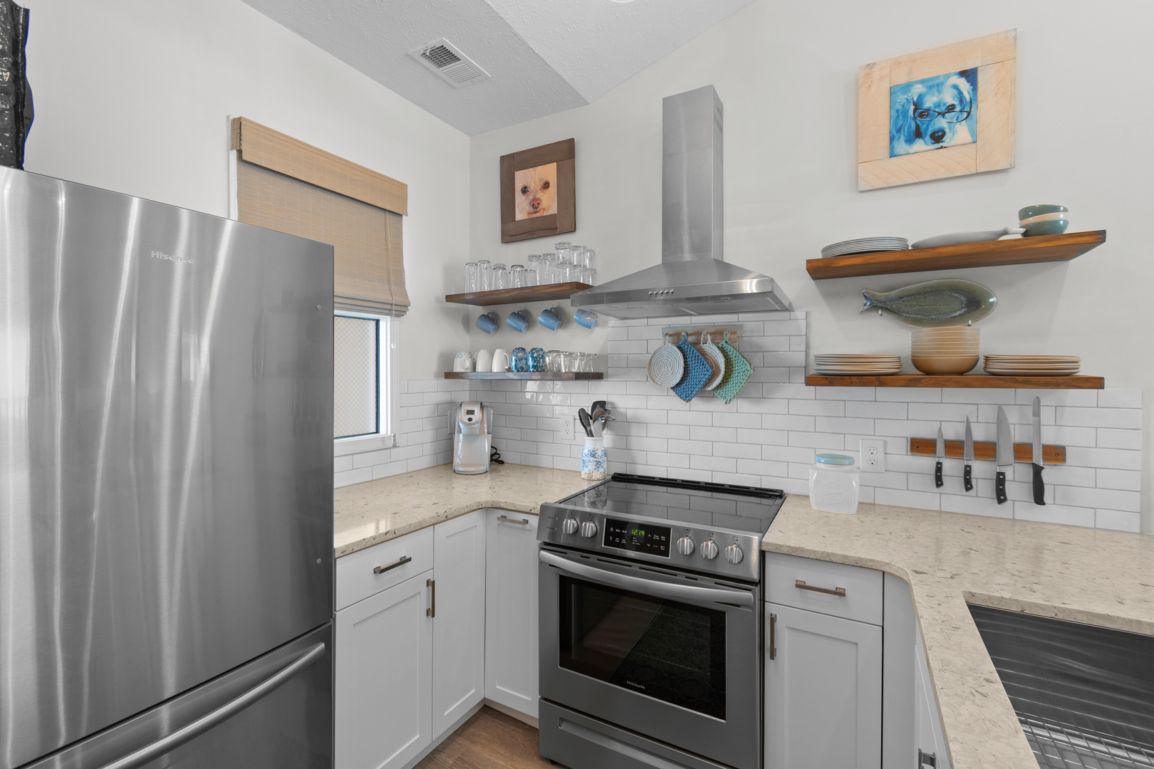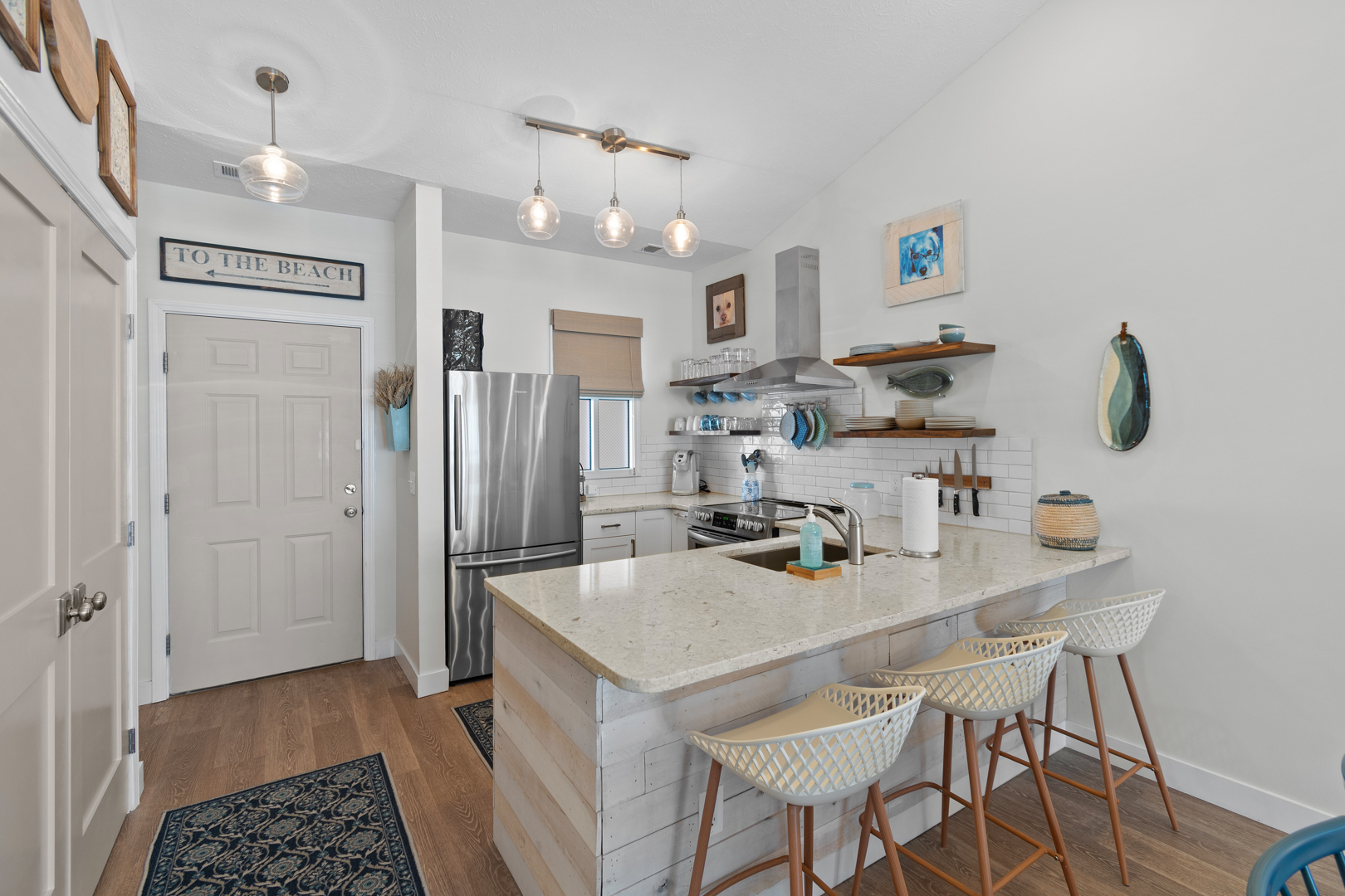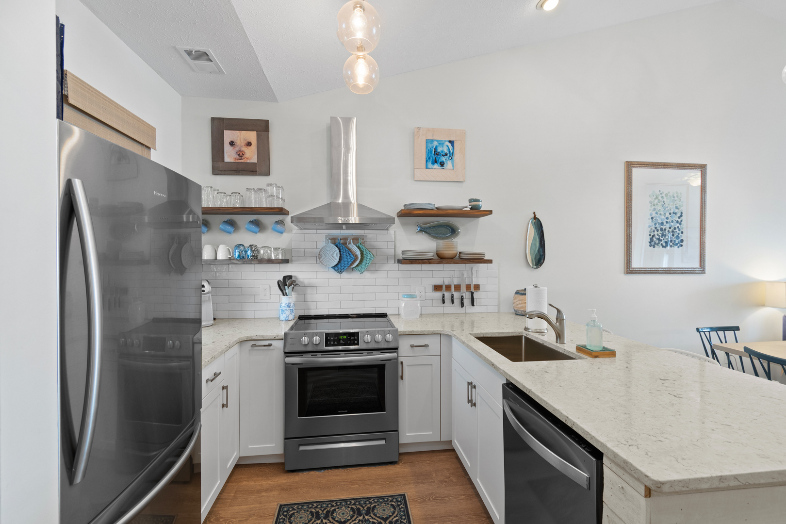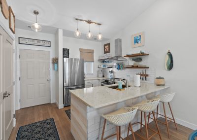 Plenty of natural light floods into this unit, contributing to its bright and cheerful feel. With LVP flooring throughout, fresh paint, and thoughtful updates, you will not need to do a thing but plan your trip. The water heater and HVAC were new in 2025 and the washer and dryer are full-size as opposed to stackable. The kitchen looks as if it could have been featured in a magazine, with quartz countertops, a large SS farmhouse sink, subway tile backsplash, stainless steel appliances including a vent hood, updated cabinetry and shelving and updated lighting fixtures. There is even a pantry for your small appliances and food items.