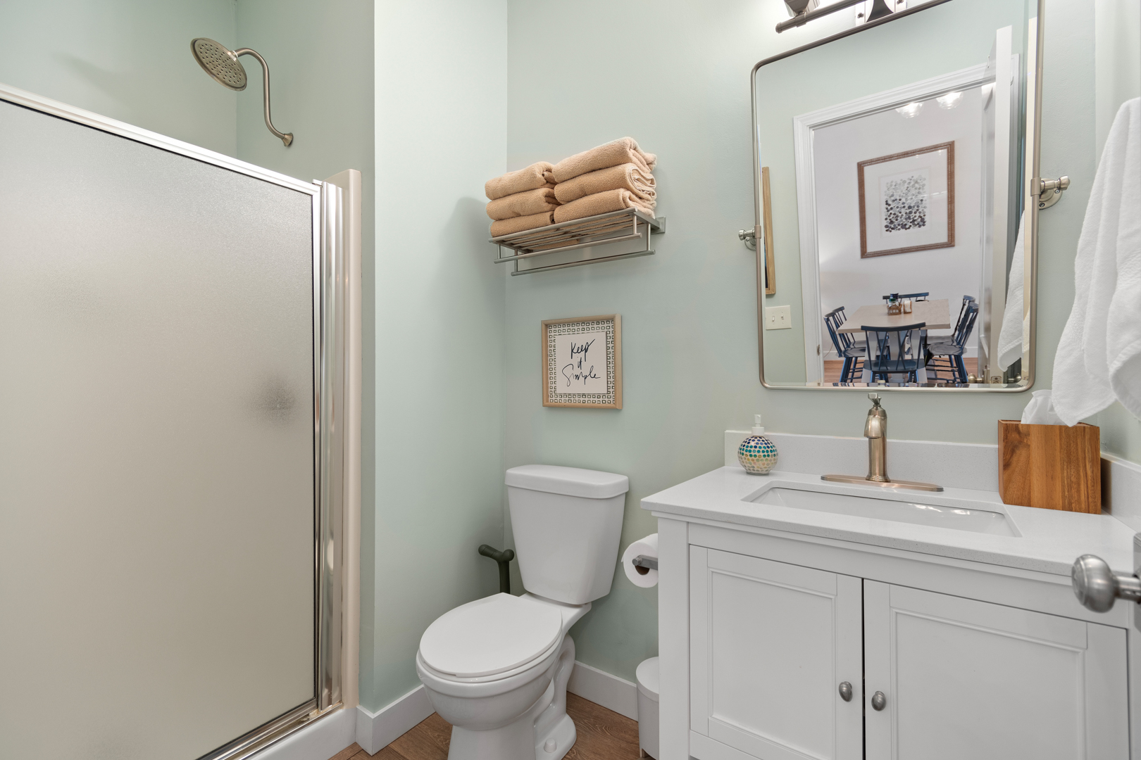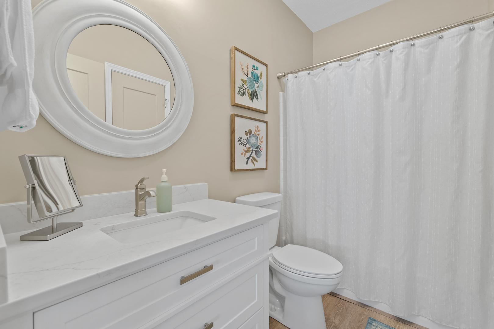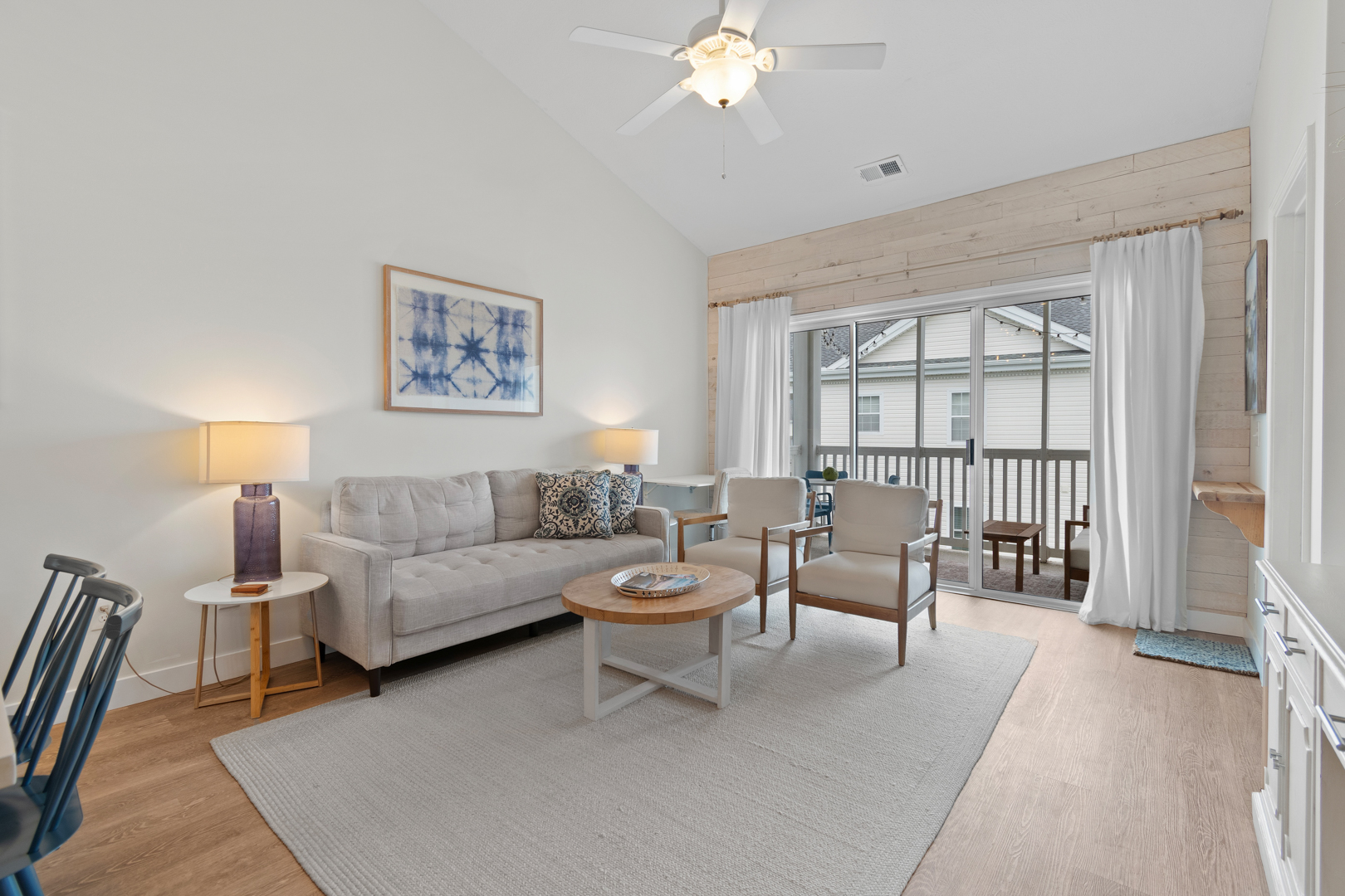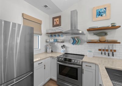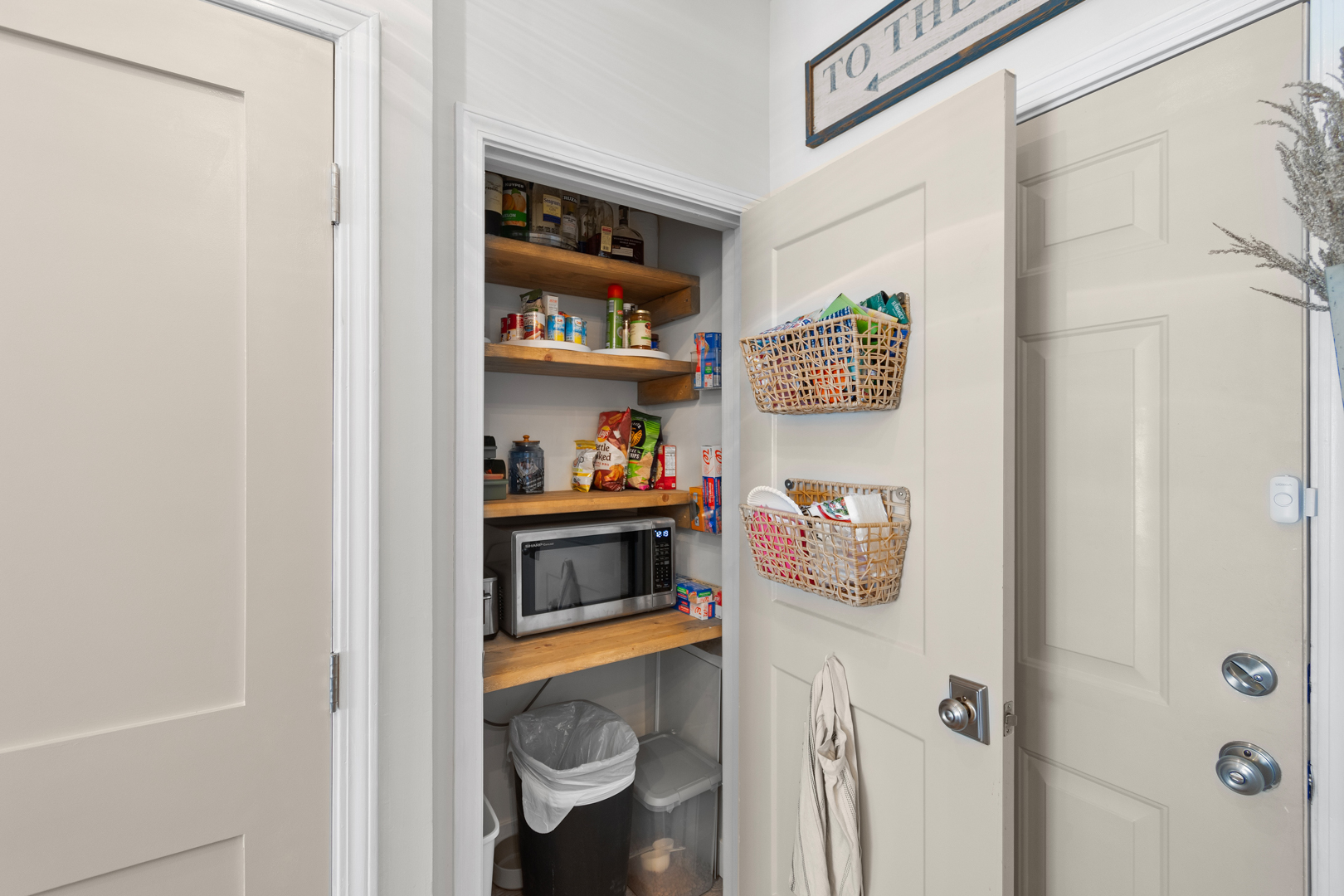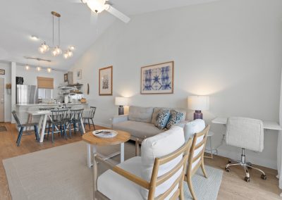 Plenty of natural light floods into this unit, contributing to its bright and cheerful feel. With LVP flooring throughout, fresh paint, and thoughtful updates, you will not need to do a thing but plan your trip. The water heater and HVAC were new in 2025 and the washer and dryer are full-size as opposed to stackable. The kitchen looks as if it could have been featured in a magazine, with quartz countertops, a large SS farmhouse sink, subway tile backsplash, stainless steel appliances including a vent hood, updated cabinetry and shelving and updated lighting fixtures. There is even a pantry for your small appliances and food items.